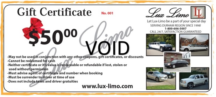 A Lux Limo gift certificate can be used with any of our services - or if you want to get creative, plan a surprise itinerary for them!